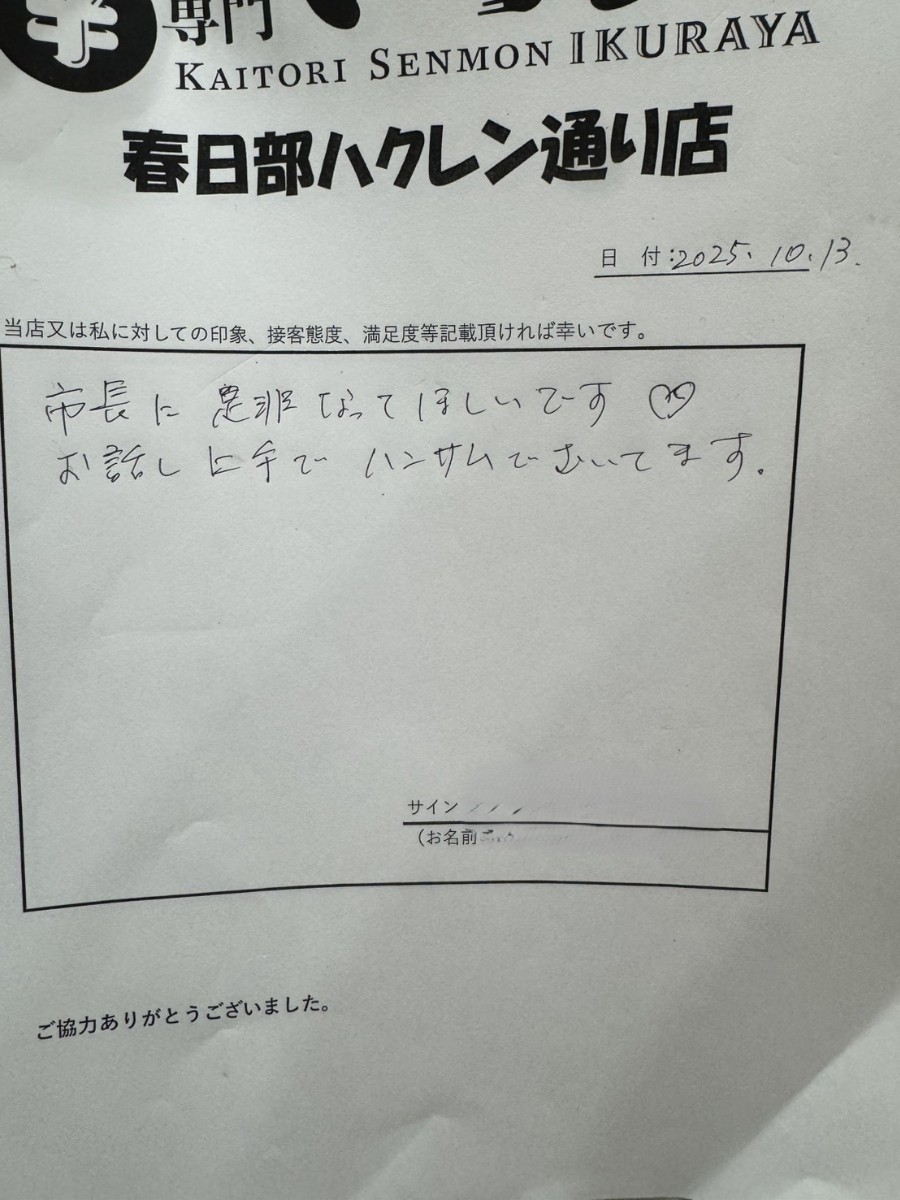 - <br><div>前回伺った時も思いましたが、話がとてもおもしろい</div><div><br></div><div>査定はもちろんですが、とにかく話がおもしろい。</div><div><br></div><div>リズムが良い。また伺います。ありがとうございます。</div>